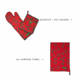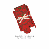 This set is beautifully wrapped and makes for a wonderful gift for the Christmas season. It contains: 1 - Gauntlet, 1 - Pot Holder & 1 - All Purpose Towel